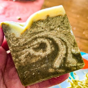 Celtic Sea Salt for a scrubby feel, then infused with Matcha, French Green Clay, and Nettle powder. Scented with Basil, Lemongrass, and Lemon Eucalyptus.